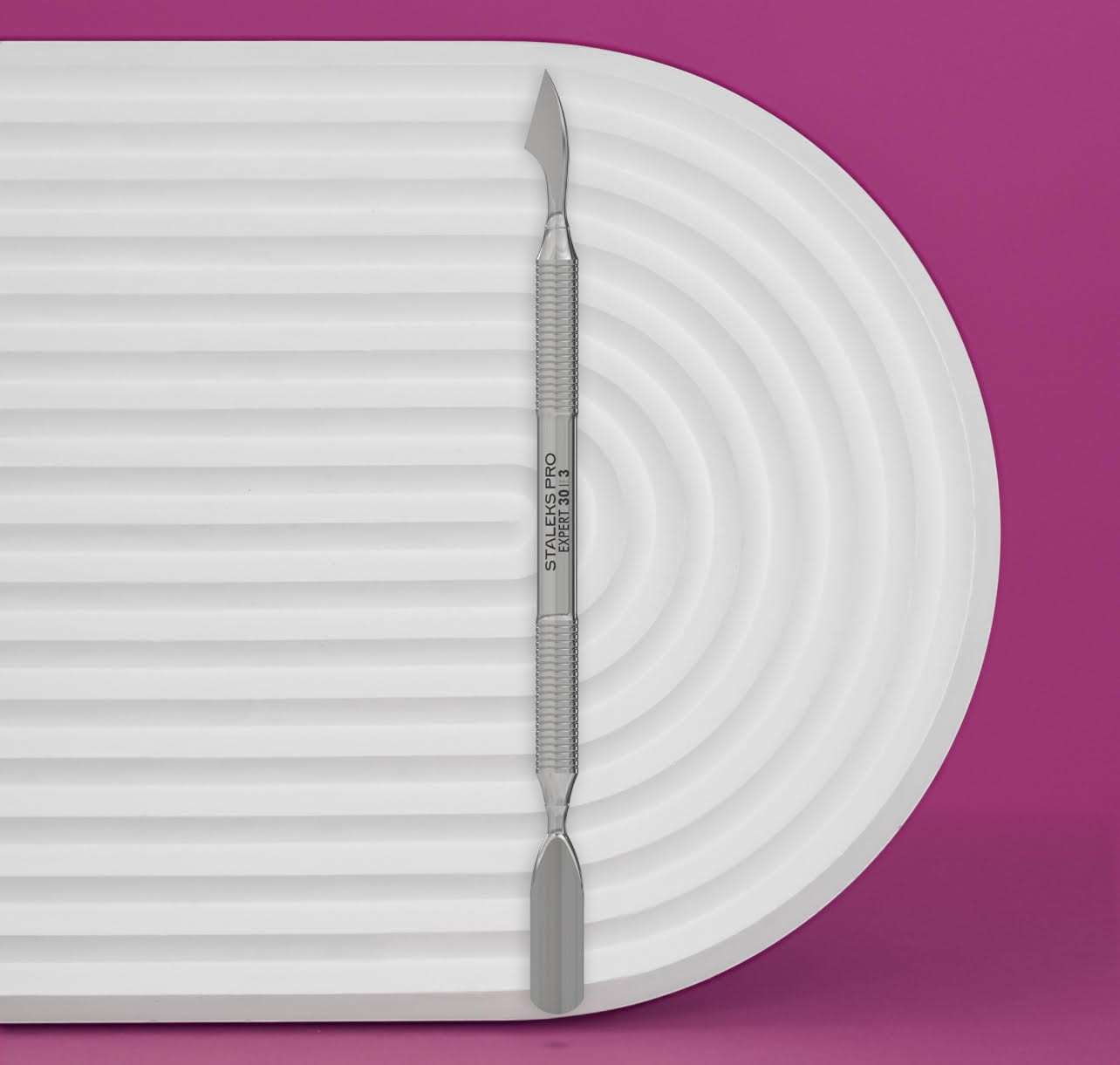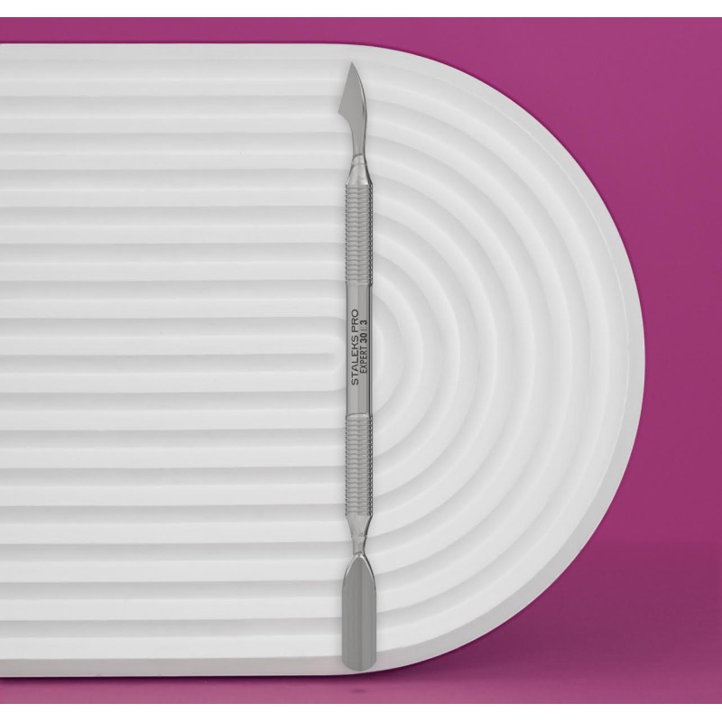 Il Staleks Pro Spingipelli Professionale Expert 30/3 è uno strumento di alta precisione con spintore largo arrotondato e punta per pulire sotto l'unghia, ideale per trattamenti delicati e professionali delle cuticole e delle unghie.