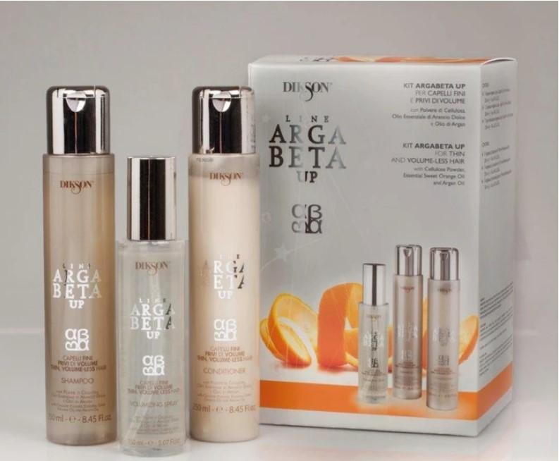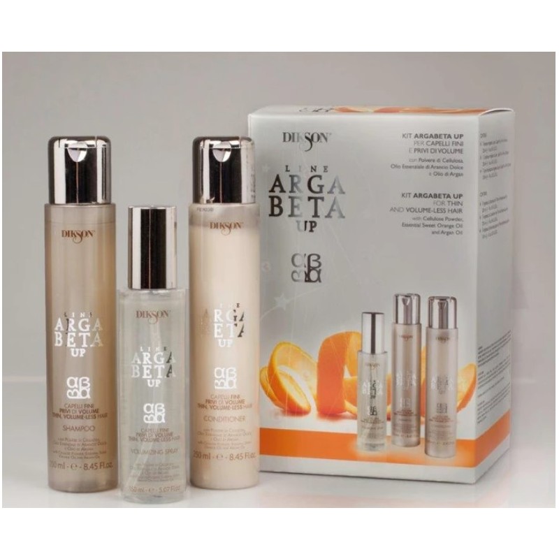 Il DIKSON Argabeta UP Kit per capelli fini include uno shampoo, un conditioner e uno spray volumizzante, tutti arricchiti con olio di argan per nutrire, rinforzare e donare volume senza appesantire.