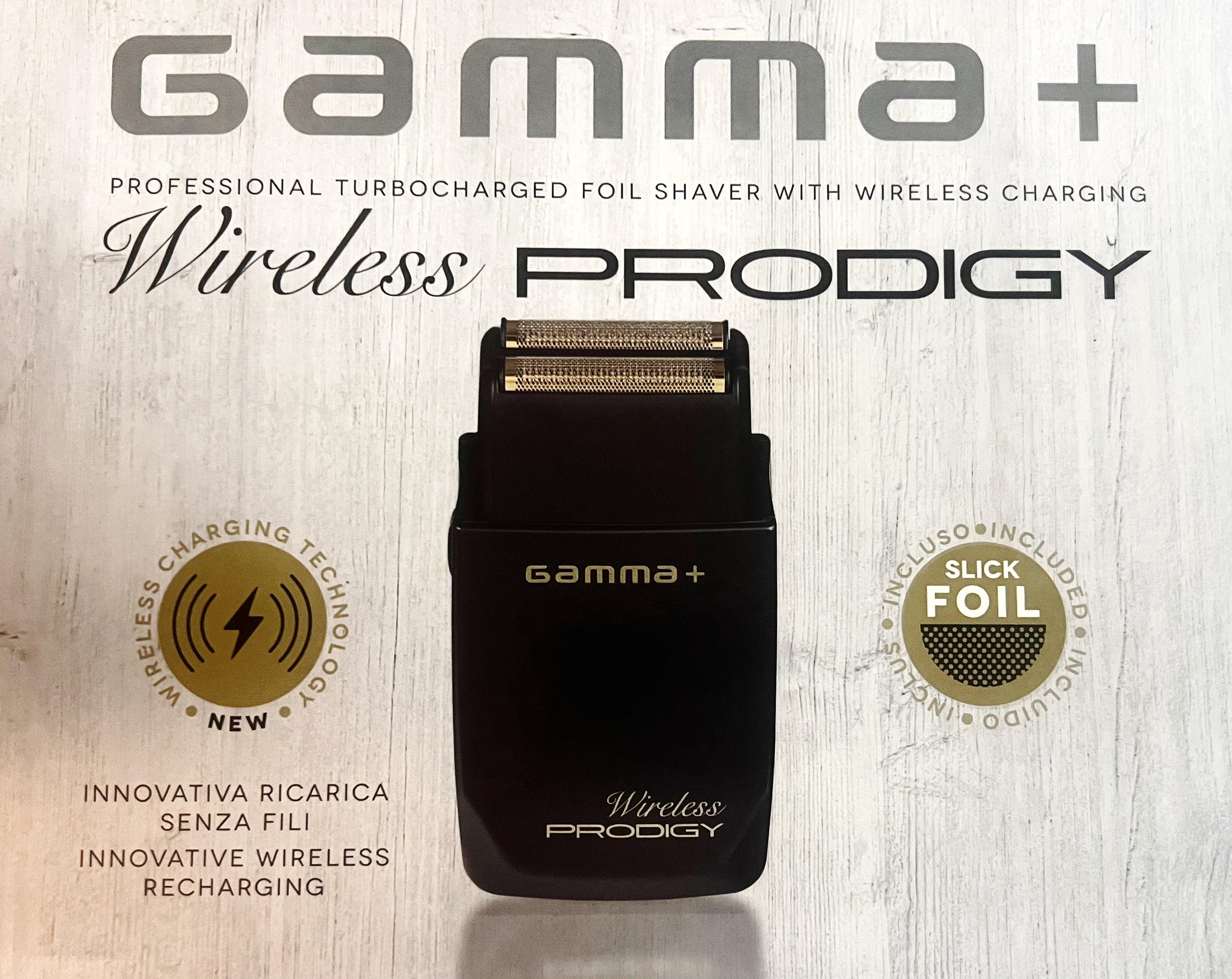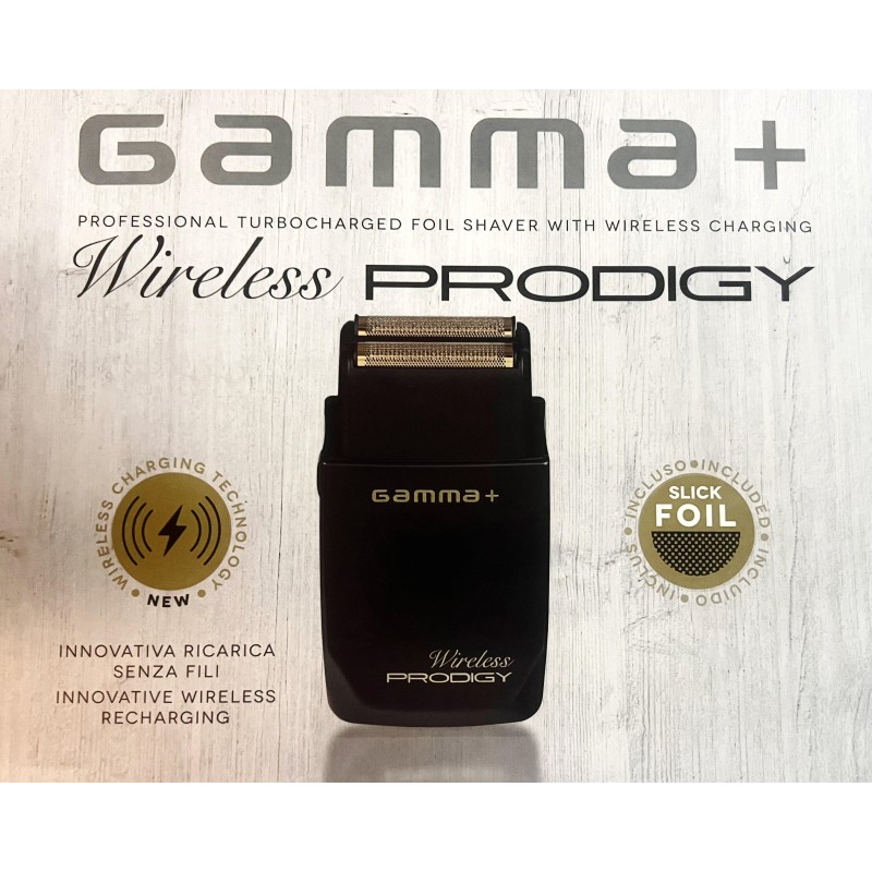 Il Gamma+ Wireless Prodegy è un rasoio elettrico professionale di ultima generazione è stato progettato per garantire rasature precise e confortevoli è dotato di una batteria wireless a lunga durata, questo rasoio offre la possibilità di movimento senza la presenza di cavi con un funzionamento di 120 minuti con una sola carica, le sue lamine ultra fini in gold titanium ipoallergenica garantiscono una rasatura a pelle liscia e impeccabile mentre la testina flottante si adatta senza problemi ai contorni del viso e del collo, non offre irritazioni al taglio. Ha incluse lame sfalsate in FORGED in gold titanium e CRUNCKY in acciaio INOX, motore professionale 9.000 rpm con batterie al Litio, caricatore con attacco mini USB multifunzione, indicatore luminoso di stato della carica rosso e verde.
